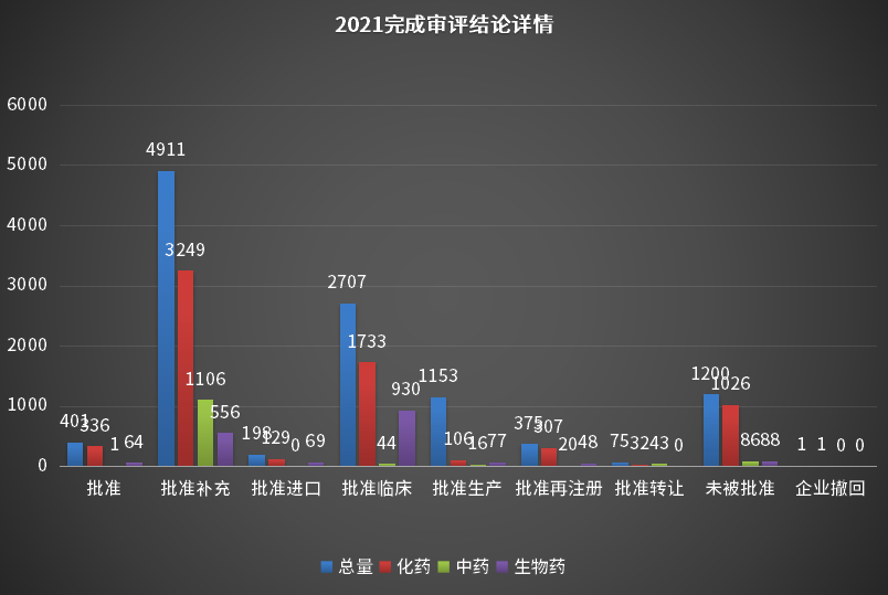 根据药智注册与受理数据库最新统计,2021年(注:状态开始时间(药智)从2021年1月1日至2021年12月31日)审评完结受理号数量为11210个,药智收录到结论的数量为11021个受理号,其中化药7874个,中药1316个,生物制品1832个。2021年CDE审评完结结论详情统计见图7。
