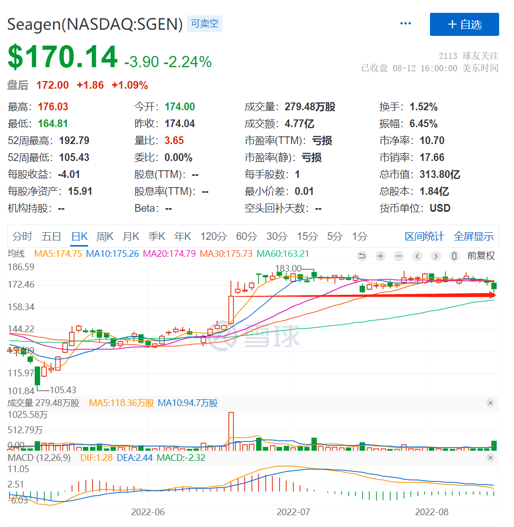 收购传闻被曝出来后,Seagen股价大涨,此后一直处于高位,败诉的消息传来后其股价应声下跌,达到了近期的最低点位,如果此时进行并购谈判,会是一个压价的好机会。