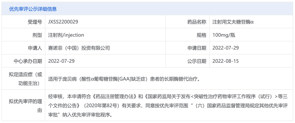 8 月 15 日,CDE 官网显示,拟将赛诺菲注射用艾夫糖苷酶 α 在国内的上市申请纳入优先审评,用于庞贝病(酸性 α 葡萄糖苷酶 [GAA] 缺乏症)患者的长期酶替代治疗(受理号:JXSS2200029)。