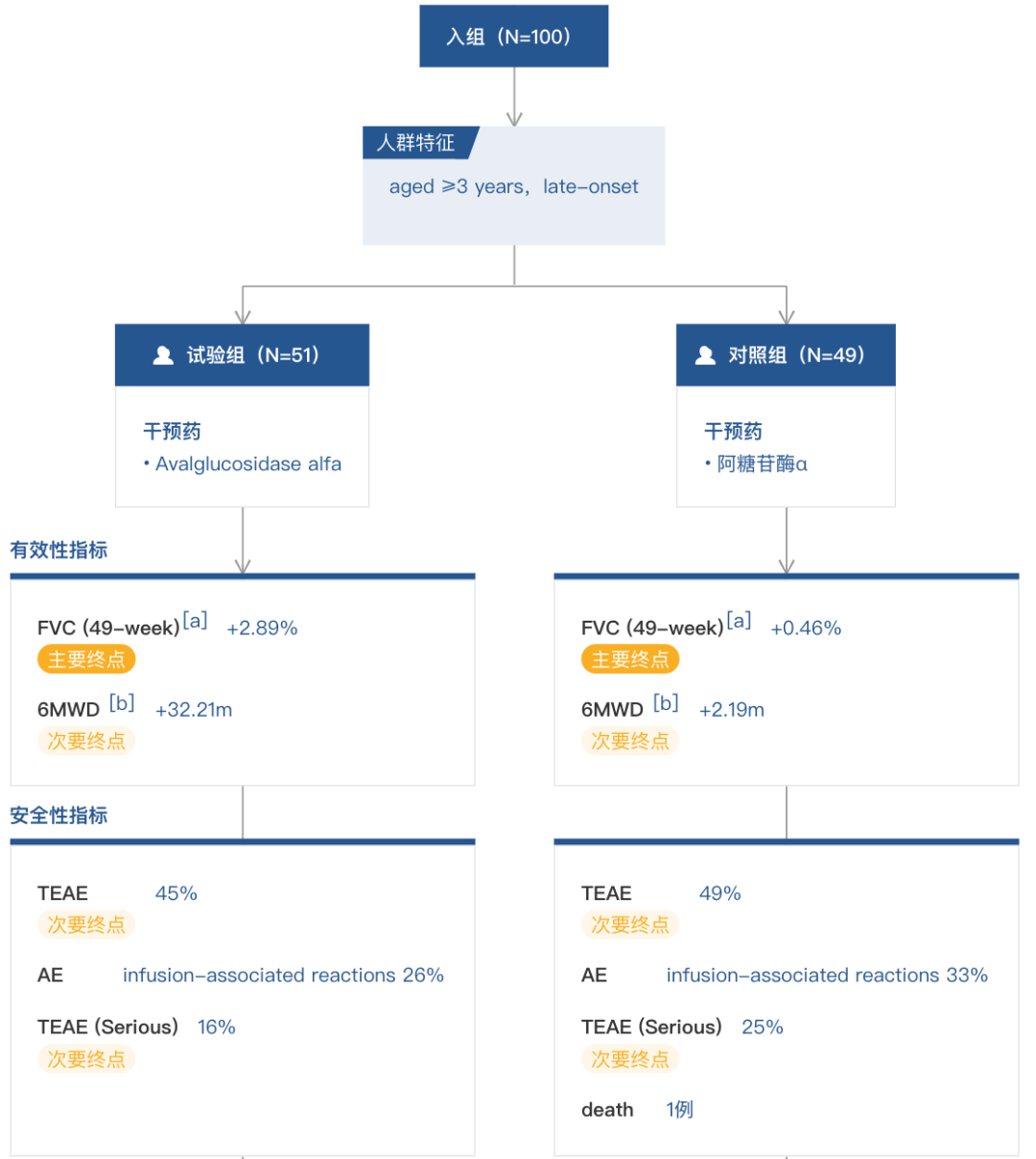 结果显示,治疗近一年(49 周)期间,接受 Avalglucosidase alfa 治疗的患者,其关键表现(呼吸障碍和活动能力下降)显示出临床意义的改善,且疗效非劣效于阿糖苷酶 α,研究达到主要终点: