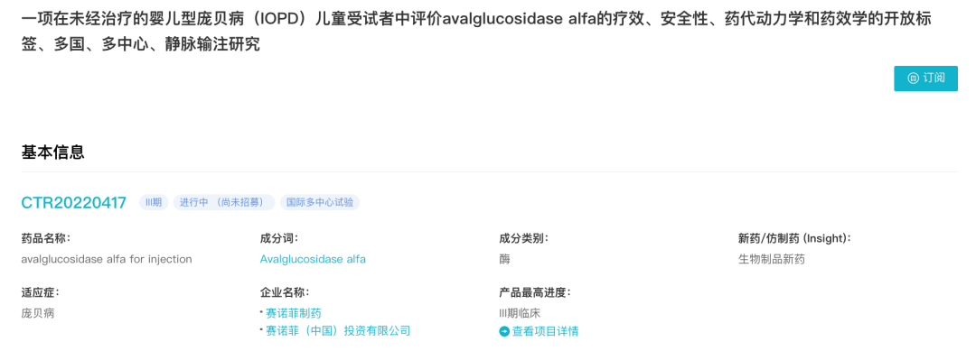 目前,据 Insight 数据库显示,赛诺菲正在国内开展一项未经治疗的婴儿型庞贝病(IOPD)儿童受试者中评价 Avalglucosidase alfa 的疗效、安全性、药代动力学和药效学的开放标签、多中心静脉输注 III 期临床研究(登记号:CTR20220417),该研究于今年 2 月首次公示临床试验,当前正在进行中。