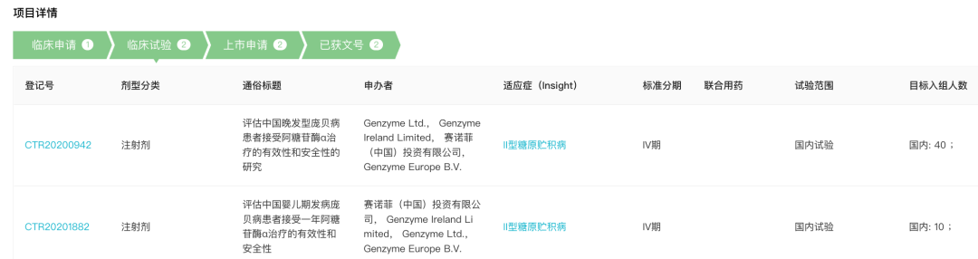 据 Insight 数据库显示,针对 IOPD 和 LOPD 患者,当前阿糖苷酶 α 正在国内开展两项 IV 期临床研究(登记号:CTR20200942、CTR20201882)。