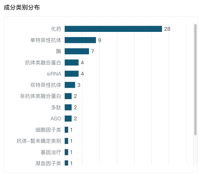 赛诺菲作为罕见病治疗领域的领先者之一,据 Insight 数据库显示,目前在罕见病领域赛诺菲共有 67 款新药(含改良新)在研。其中,化药 28 款,占比 41.79%,此外,还涉及 单抗、双抗、多肽、抗体类融合蛋白等。