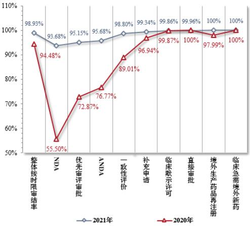 国家药监局发布的《2021年度药品审评报告》显示,2021年共115件注册申请(69个品种)纳入优先审评审批程序。其中,符合附条件批准的药品占35.65%,符合儿童生理特征的儿童用药品新品种、剂型和规格占29.57%。此外,全年整体按时限审结率98.93%,NDA、ANDA、纳入优先审评审批程序的注册申请按时限审结率均超过90%。随着审评审批制度改革的持续深化及相关政策的逐步落地,优先审评资源逐年加大向具有临床优势的新药、儿童用药、罕见病药物注册申请倾斜。