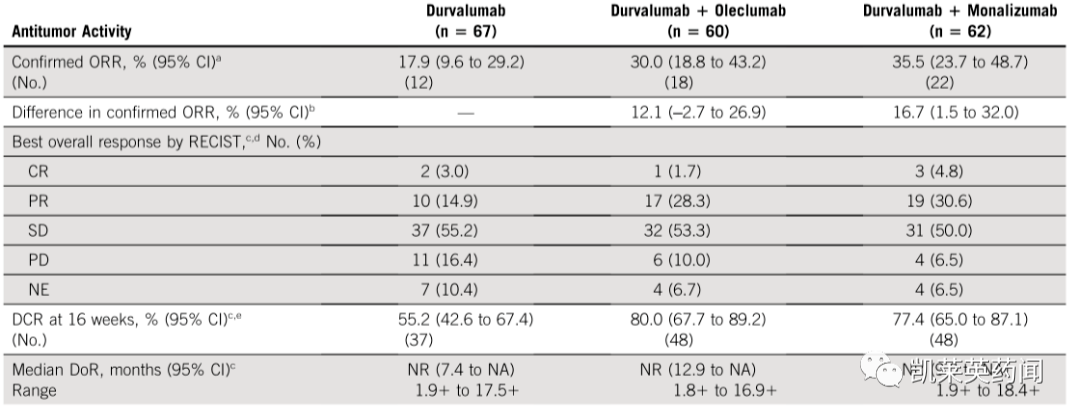 Monalizumab (IPH2201)是一种潜在的first-in-class的免疫检查点抑制剂,靶向 CD8+ T 细胞和 NK 细胞上表达的 NKG2A 受体。此前在随机、2 期 COAST 和Neo-COAST 研究中报告了令人鼓舞的数据。COAST是一项全球性、开放标签、随机、II期、多药平台研究,单独使用度伐利尤单抗或与oleclumab或monalizumab联合使用,作为cCRT后无进展的无法切除的III期非小细胞肺癌患者的巩固治疗,研究显示中位随访11.5个月,度伐利尤单抗单药ORR 17.9%,度伐利尤单抗联合oleclumab ORR 30.0%;度伐利尤单抗联合monalizumab ORR 35.5%。两种联合用药的无进展生存期(PFS)均较度伐利尤单抗单药有所延长,12个月的PFS率更高。探索性亚组分析中,尽管基于组织学、既往含铂化疗、ECOG OS评分、PD-L1状态的患者人数少,可观察到联合治疗组PFS获益。