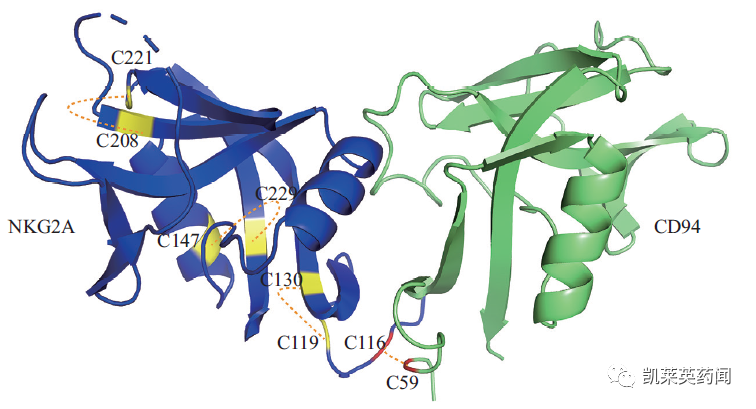 NKG2A 在结构上属于II型跨膜蛋白,可分为胞质内N末端区域(1~70氨基酸)、跨膜区域 (71~93氨基酸)和膜外区域(94~233氨基酸),共由233个氨基酸组成, 其结构域位于118~231区间。NKG2A蛋白由7个β折叠、2个α螺旋构成, 2个α 螺旋分别位于140~149和160~169区间。NKG2A蛋白有4个糖基化蛋白修饰位点, 分别位于第102、103、151、180氨基酸, 以及3个二硫键(119~130、147~229和208~221对氨基酸)。NKG2A的第116氨基酸位点与CD94第59氨基酸位点以二硫键结合形成异质二聚体。编码人NKG2A的基因为KLRC1, 该基因定位于第12号染色体上, 目前已经观察到KLRC1具有6个不同亚型的可变剪接转录本。