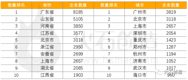 从新增企业地域分布来看,企业数量排名前十的省份为广东省、山东省、河南省、江苏省、北京市、浙江省、安徽省、上海市、湖北省、江西省,占全国新增企业总量的62.94%。企业数量排名前十的城市为广州市、北京市、上海市、深圳市、重庆市、郑州市、杭州市、济南市、武汉市、海口市,占全国新增企业总量的32.37%。