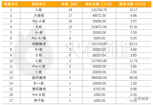 从融资数量来看,以A轮和天使轮发生的融资事件最多,分别为19起和17起。从融资金额来看,股权融资获得最高融资金额98.00亿元;其次,B轮的融资金额也较为突出,融资金额达31.91亿元。