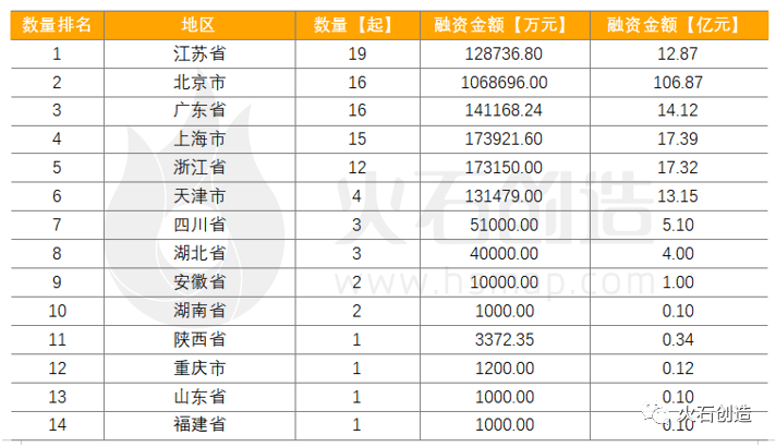 从融资地域看,本月融资事件主要分布在江苏省(19起)和北京市(16起)。从融资金额来看,北京市最为突出,融资金额高达106.87亿元;其次,上海市也较为突出,融资金额达17.39亿元。
