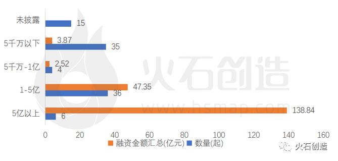 从融资额度来看,本月96次融资事件,其中单笔融资金额在5亿以上的融资为6起;单笔融资金额超过亿元的融资事件42起,合计融资金额约186.19亿元,占本月融资规模总额的96.68%。