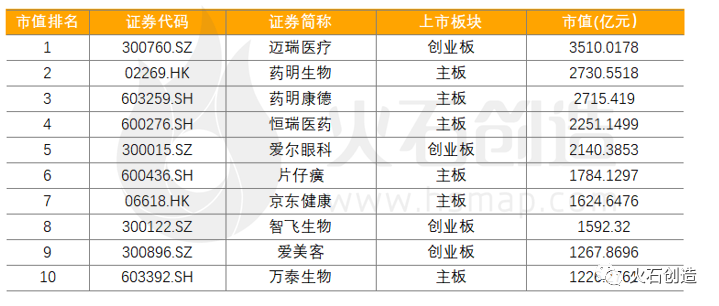 表4:2022年7月市值排名前十的生物医药企业