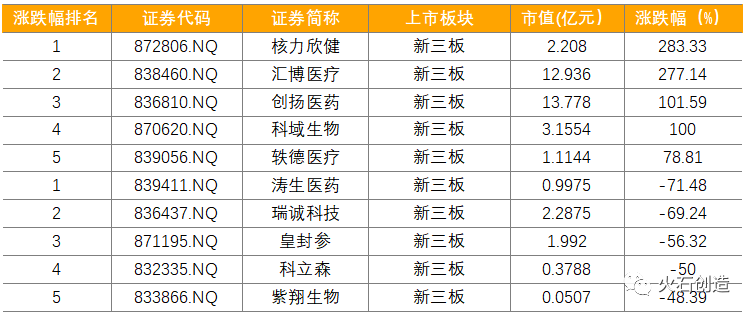 同上月相比,核力欣健、汇博医疗、创扬医药、科域生物、轶德医疗的涨幅较大,其中核力欣健(872806)市值涨幅高达283.33%,汇博医疗(838460)市值涨幅高达277.14%;涛生医药、瑞诚科技、皇封参、科立森、紫翔生物的跌幅较大,其中涛生医药(870066)市值跌幅达71.48%,瑞诚科技(836437)市值跌幅达69.24%。