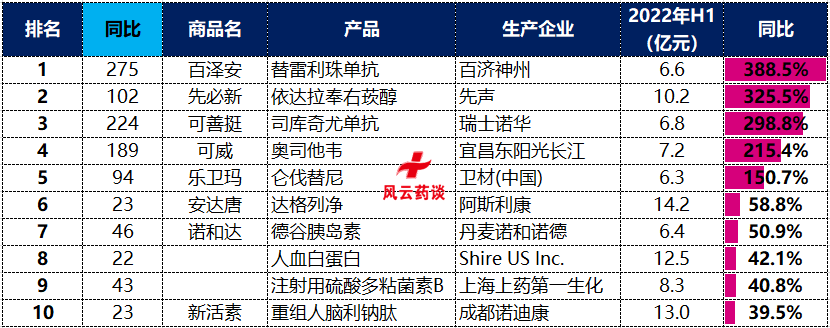 表2:2022年H1产品百强增幅 TOP 10(样本医院,单位:亿元)