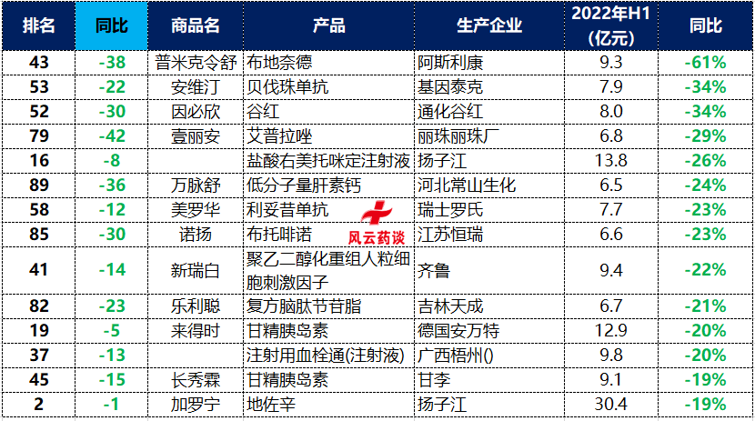 表3:2022年H1产品百强降幅 TOP 10(样本医院,单位:亿元)
