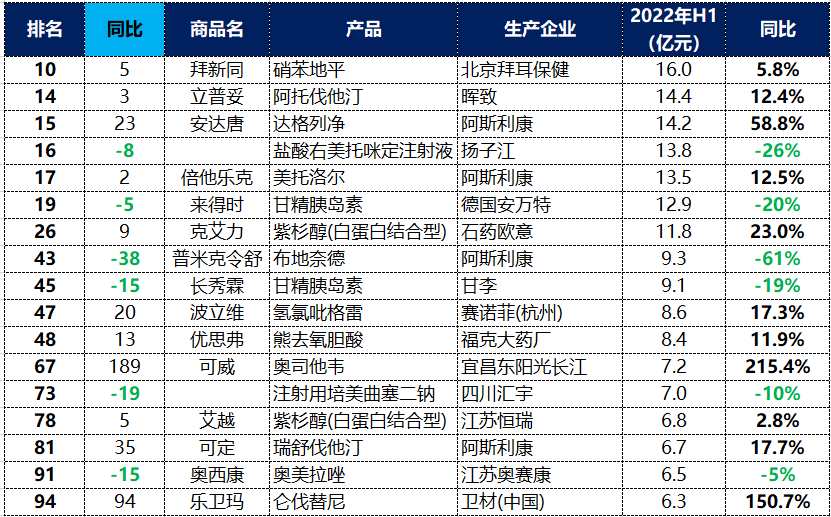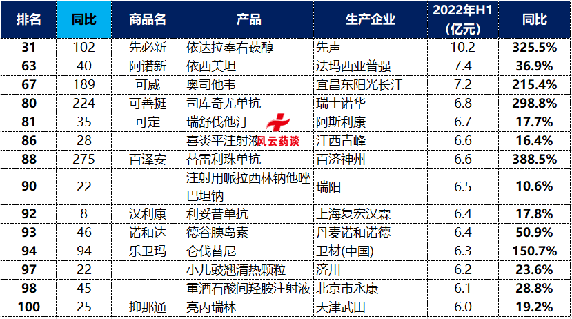表1:2022年H1产品百强明细(样本医院,单位:亿元)