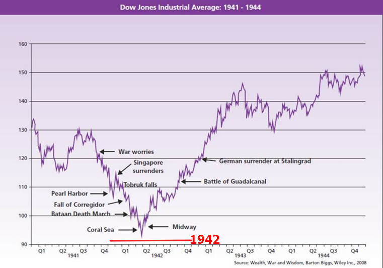 如此惨烈的寒冬中,股市是如何表现的呢?如果用道琼斯工业平均指数(Dow Jones Industrial Average)做指标,股市在1942年中之前的三个季度里从高点跌了37%。但令人吃惊的是,从该年第3季度开始,股市一路上扬,一直涨到战争结束。