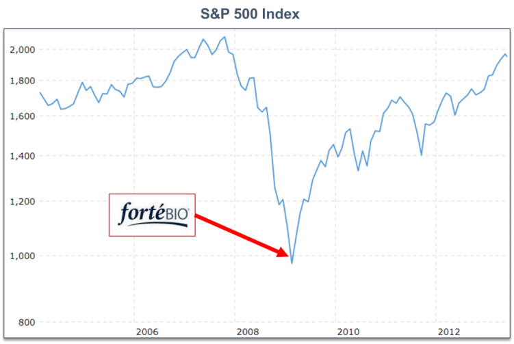 回答这个问题之前让我讲一个亲身经历的案例。2008年金融危机,标普500大跌50%左右,许多巨无霸企业面临倒闭的危险。我就在那时遇上了一个叫forteBIO的公司,它很惨,现金马上就烧光了,因为正值“隆冬”,没人敢投它。