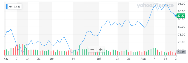 截止到上周(2022年8月20日),XBI在过去60天左右涨了1/3多: