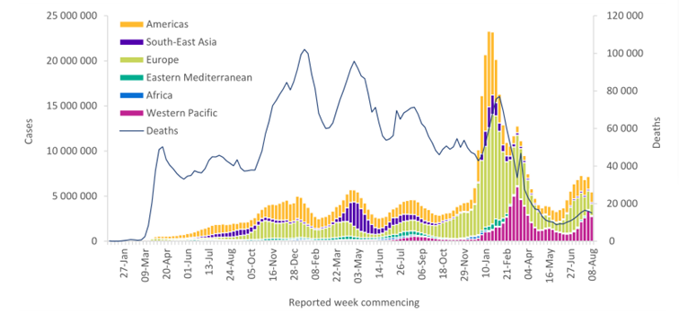 图2 截至2022年8月14日世卫组织区域每周报告的新冠肺炎病例和全球死亡人数(图源:[1])