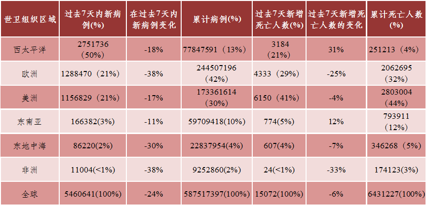 截至2022年8月14日,全球报告了5.87亿例确诊病例和640万例死亡。在区域一级,全球六大区域每周报告的新增病例数量均有所下降:非洲区域(-38%)、欧洲区域(-38%)、东地中海区域(-30%)、西太平洋区域(-18%)、美洲区域(-17%)和东南亚区域(-11%)。每周新增死亡人数在西太平洋(+31%)和东南亚区域(+12%)有所增加,而在非洲区域(-33%)、欧洲区域(-25%)、东地中海区域(-7%)和美洲区域(-4%)减少或保持稳定(图2)。