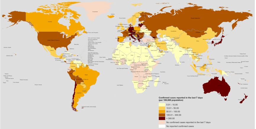 图3 2022年8月8日至14日按国家、地区和地区划分的每10万人口新冠肺炎病例报告(图源:[1])
