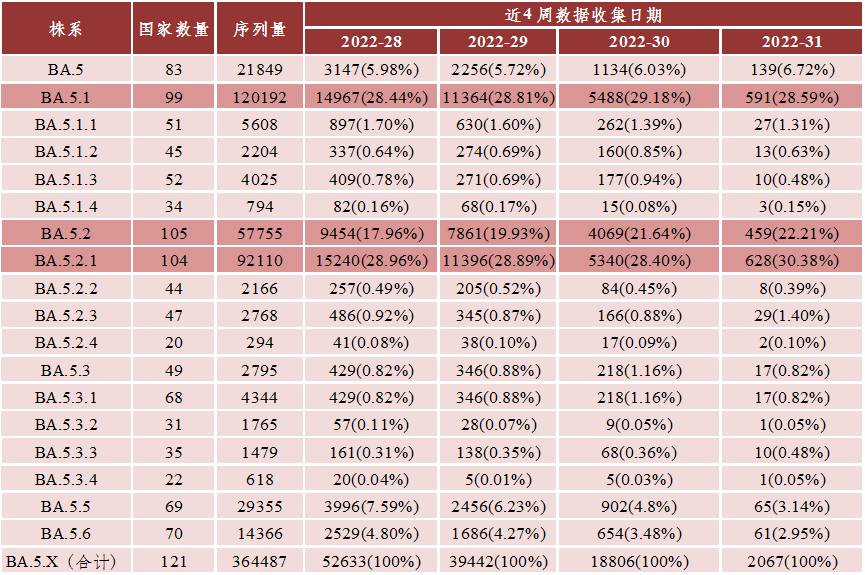 表2 过去4周内BA.5后代谱系的相对比例(按样本采集日期)