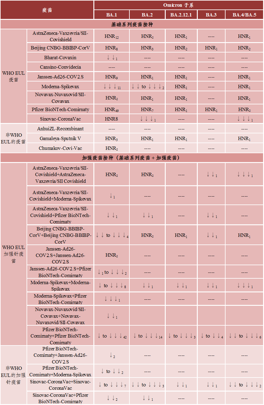 注:EUL(Emergency Use Listing)表示紧急使用名单,HNR(high non-response)表示高不响应,所有研究的中位百分比响应<75%。下标数字表示此项研究的数量。箭头概括了疫苗有效性或中和减少的幅度:“↔”表示中和减少<2倍;“↓”表示减少2至<5倍;“↓↓”表示减少5到<10倍;“↓↓↓”表示减少≥10倍。