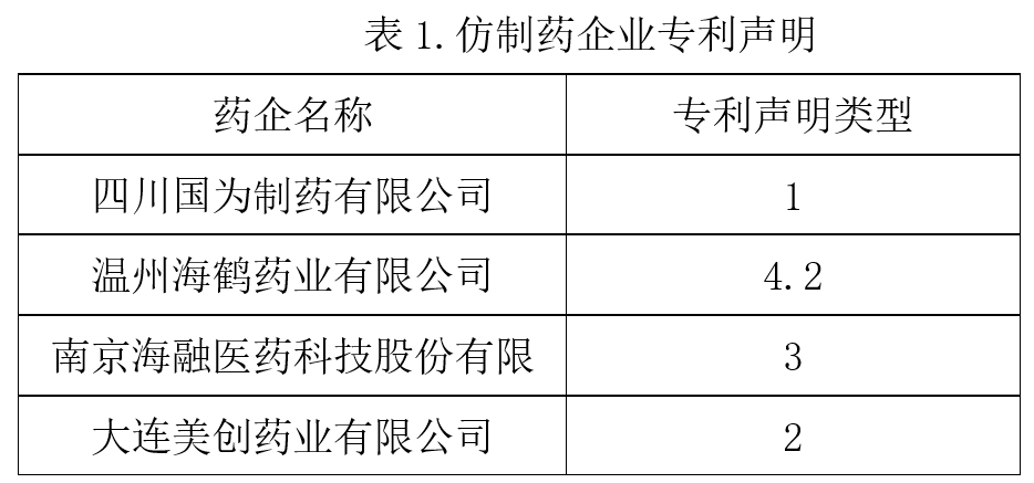 原研于2020年12月在国内获得批准上市后,先后有5家药企按照4类仿制药向CDE提出了上市申请。与此同时,其中4家药企在中国上市药品专利信息登记平台进行了专利声明(具体声明类型见表1)。