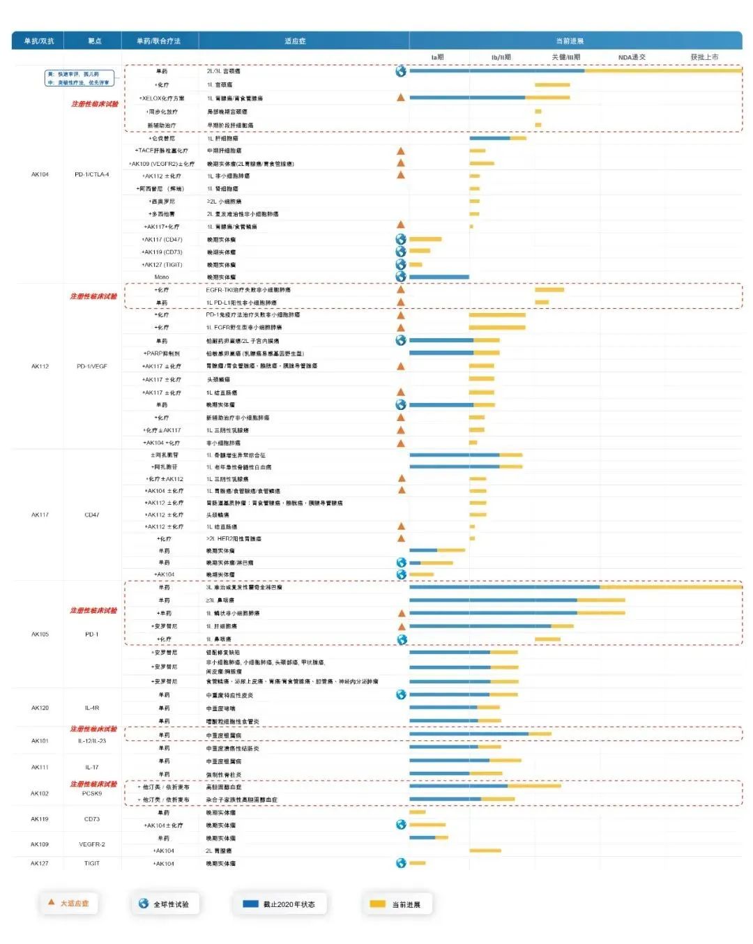 在研PD-1/VEGF双抗(依沃西单抗,研发代号AK112)的2项临床研究也进入III期阶段,包括AK112联合化疗治疗EGFR-TKI耐药的EGFR突变的晚期nsq-NSCLC的III期临床研究和AK112单药对比帕博利珠单抗单药一线治疗PD-L1+的NSCLC的III期临床研究。