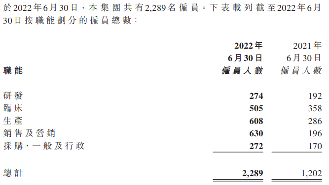 康方生物员工数量较2021年同期几近翻倍,已经达到2289人,其中研发与临床接近800名,且已经建立起630人的销售及营销团队。