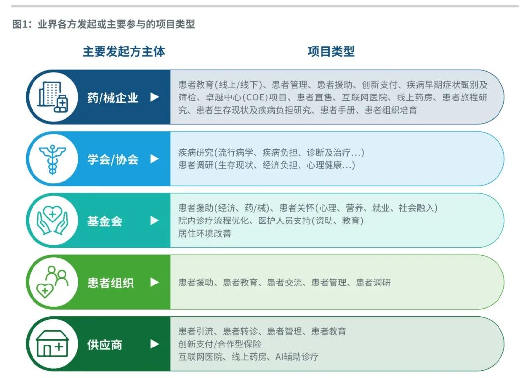 目前药/械企业、学会/协会、基金会、患者组织、服务供应商都已经参与到“患者为中心”理念指导下的项目开展种,只是鉴于各方利益诉求的差异,他们在当前政策环境和行业背景下发起或主导的项目类型也有所差异。
