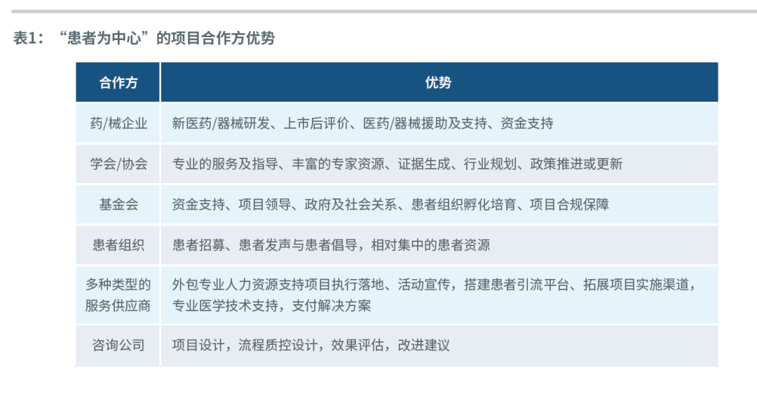 在“患者为中心”理念指导下,各参与方除了会单独发起一些符合他们各自利益诉求的项目外,也更多地看到了他们之间形成的各种不同的外部合作模式。不同的项目合作方在项目中有不同的诉求,其所掌握的资源和优势也各有差异。