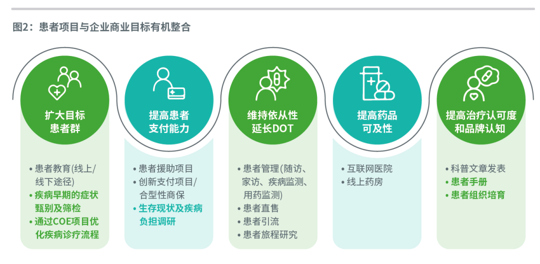 药/械企业了解并满足患者需求,除了可以实现改善患者疾病预后的目标,也是企业/项目长期可持续发展的需求。目前企业发起/主导的患者项目主要从五个商业目的出发(图2),有些项目在实现商业利益的基础上确实也同时实现了某种程度的患者获益,但仍然有部分项目的设计还有待优化,以实现进一步贴近“患者为中心”的理念。