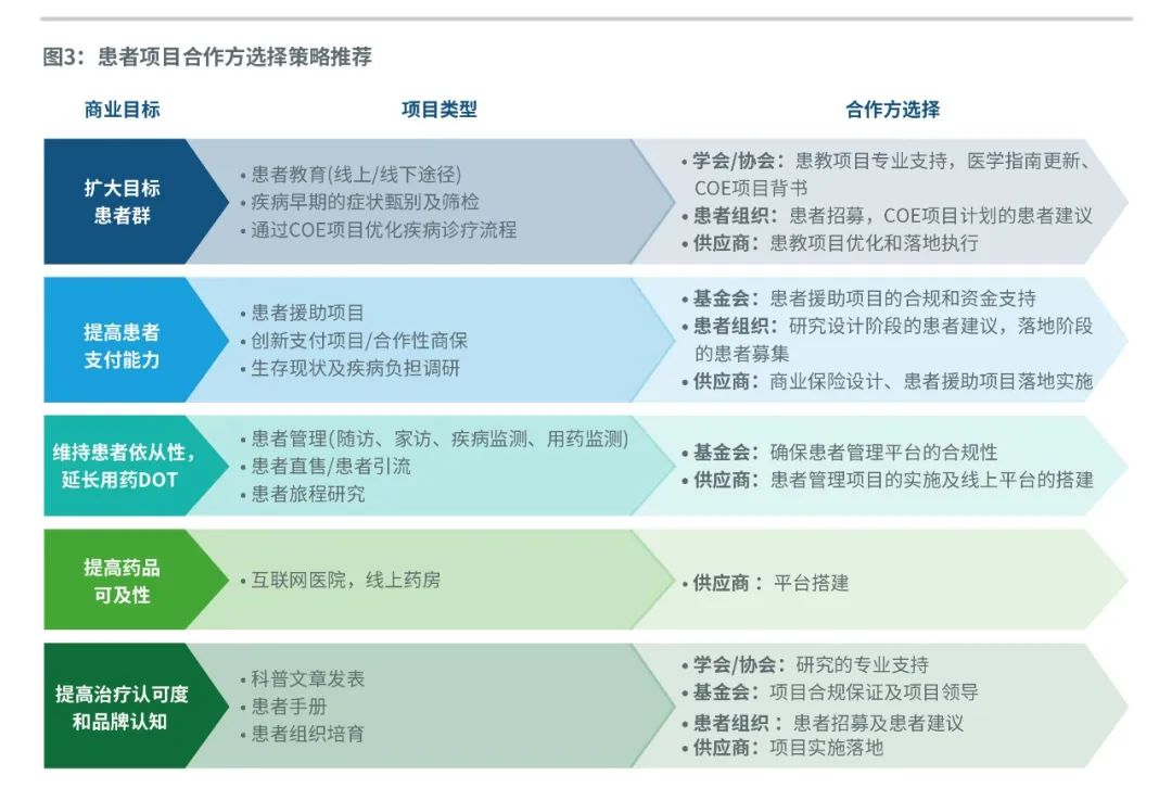 除了对于目前药/械企业主要参与的患者项目类型的梳理和分析,我们也从企业的角度总结了基于不同的商业目标下开展的不同项目类型对合作方选择策略的推荐。