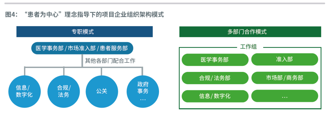 另外,在项目的组织管理方面,基于不同的疾病领域和产品管线特点,当前企业形成了两种典型的项目组织架构模式。