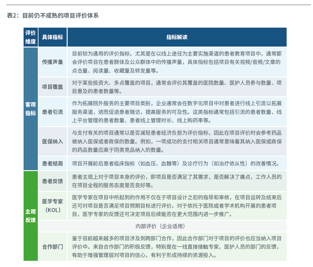 当前业界开展的“患者为中心”理念指导下的项目类型多样,暂时缺乏统一的项目评价标准和体系,我们根据访谈内容,将各方提及较多的评价方式进行了整理,如表2所示。目前,在表2基础上,我们推荐首先在机构或企业内部形成一套各部门认可的指标体系,并在实践中根据每个项目的特点从指标体系中选择重要的KPI进行评估。