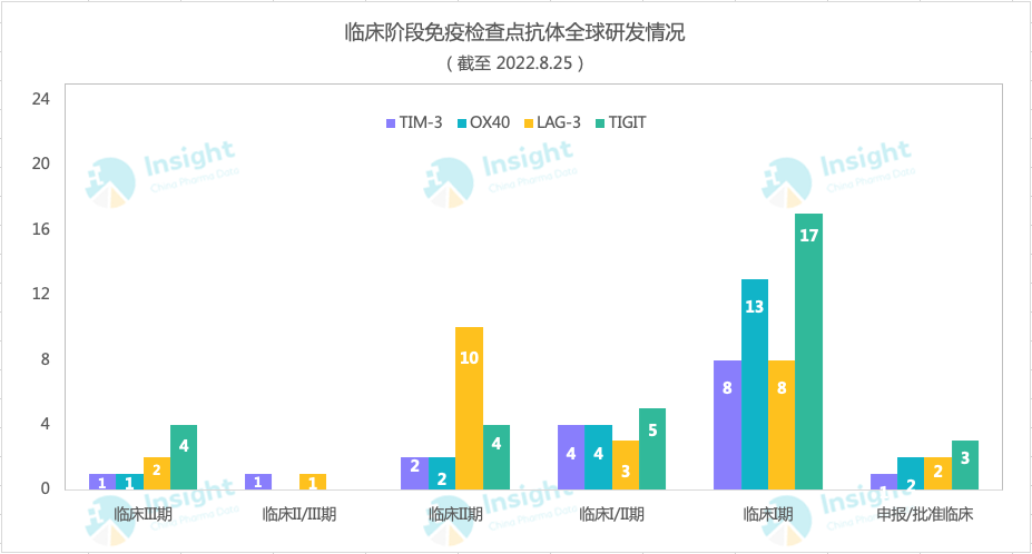 即使是在罗氏的 TIGIT 单抗接连受挫的情况下,赛道热度仍旧未减。根据 Insight 数据库显示,从全球研发情况来看,截止今日,PD-(L)1 之后的几大免疫检查点之中,TIGIT 靶点仍是头号研发大热门。