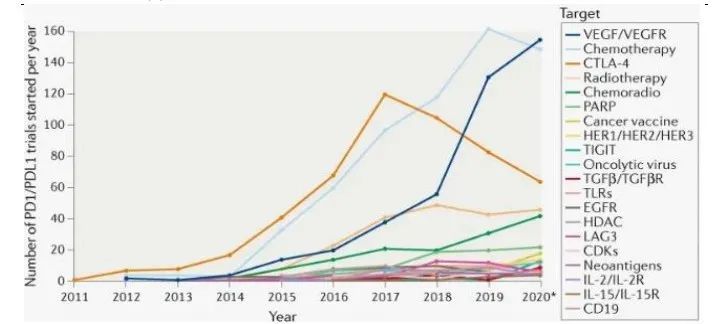 基于此,全球药企纷纷进军 TIGIT 抗体药赛道,使得管线数量愈发增加。根据长江证券研报披露,2020 年 PD-(L)1 联合疗法一共涉及 253 个靶点 (PD-1 和 PD-L1 除外),较 2017 年显著提升(增加了 129 个)。