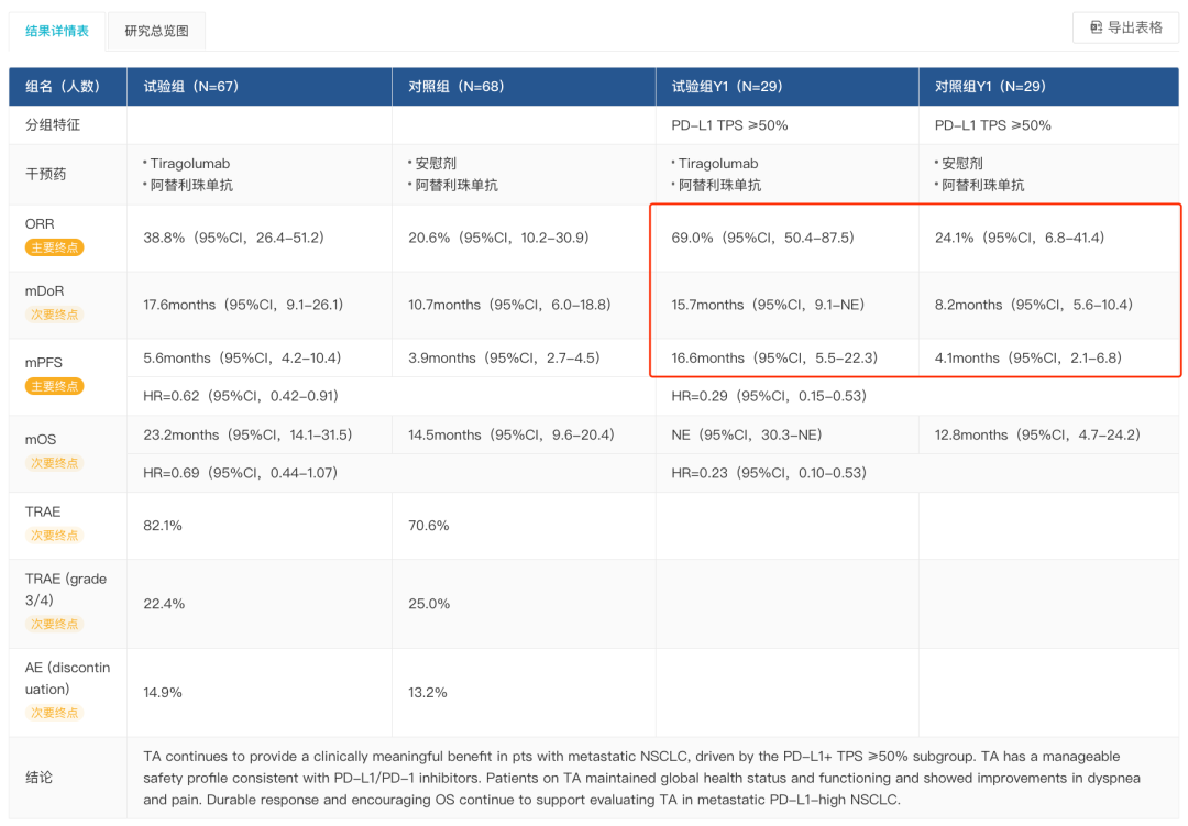 在这项全球多中心、随机、双盲的 II 期临床中,与仅接受 Tecentriq 治疗的患者组对比,TIGIT + PD-L1 组 ORR(客观缓解率)达到 31.3%,而 Tecentriq 单药患者组仅 16.2%;PFS 为 5.4 个月 vs 3.6 个月,降低了患者疾病恶化或死亡风险 43%。在 PD-L1 高表达的患者群中,与单独使用 Tecentriq 的 ORR 为 17.2% 相比,组合疗法使患者的 ORR 达到 55.2%,将患者的疾病恶化或死亡风险降低了 67%。