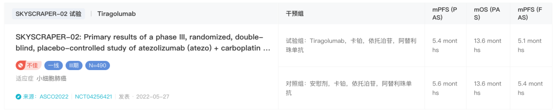 罗氏摔的「第一跤」来自 2022 年 3 月 29 日,由其研发的 TIGIT 单抗 Tiragolumab 联合 PD-L1 单抗 Tecentriq 和化疗一线治疗广泛期小细胞肺癌(ES-SCLC)的 III 期临床 SKYSCRAPER-02 研究未能达到无进展生存期(PFS)和总生存期(OS)共同主要终点。这也是全球首个 TIGIT 三期临床的失败。