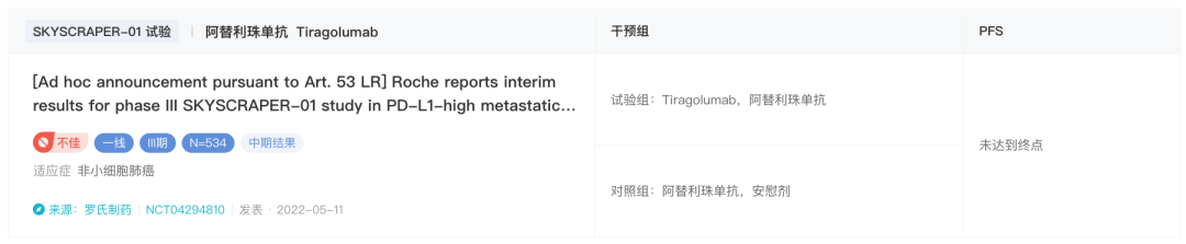 罗氏摔的「第二跤」来自 2022 年 5 月 11 日,TIGIT 单抗 Tiragolumab 联合 PD-L1 单抗 Tecentriq 联用治疗 PD-L1 高表达局部晚期或转移性非小细胞肺癌(NSCLC)的 Ⅲ 期临床未能达到无进展生存期(PFS)主要终点,另一个主要终点总生存期(OS)尚未成熟。但罗氏仍未放弃,继续开展这项临床研究直至下一次计划内的数据分析。