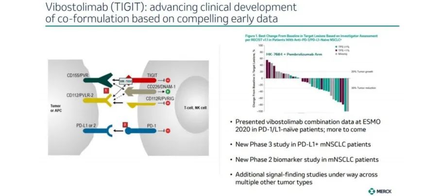其中,默沙东正在开展 TIGIT 单抗 Vibostolimab(MK-7684)联用 PD-1 单抗 Keytruda 的针对非小细胞肺癌(NSCLC)的临床 III 期研究。