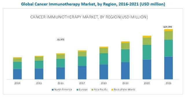 根据市场研究机构Markets and Markets报告,全球癌症免疫疗法市场已从2016年619.8亿美元增至2021年1194亿美元,复合年增长率为14.0%。这一增长主要受到诸如靶向治疗相对于传统治疗越来越多的采用、生物类似药的出现、对单克隆抗体的需求增加,癌症的高发病率等因素驱动。