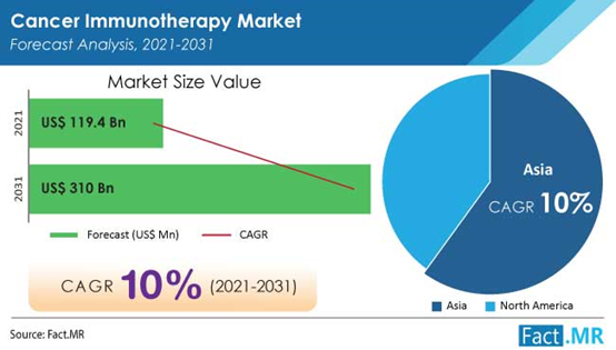 开发用于设计高级肿瘤诊断的先进研发设施的医疗保健支出正在发生,预计到2031年,这一因素将推动癌症免疫疗法的同步增长。因此,亚洲地区可能会出现相对较高的增长,2021-2031年评估期间的平均复合年增长率为10%。