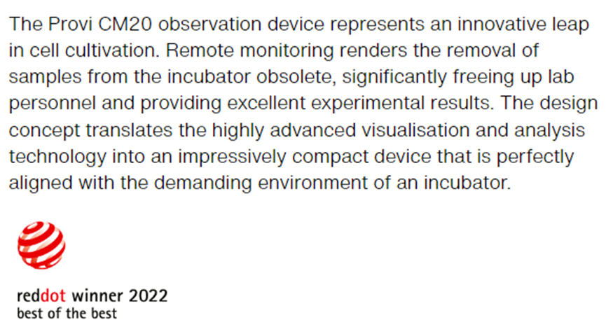 近日,奥林巴斯Provi CM20细胞培养监控系统,依靠其突破性创新技术成为2022年红点设计奖(Red Dot Design Award)产品设计类别中“Best of the Best”获得者。这场世界著名的设计大赛中,享有盛誉的红点评审团一致认为Provi CM20细胞培养监控系统代表了细胞培养流程的创新飞跃,是具有开创性的产品,特授予此荣誉。