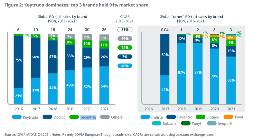 据IQVIA统计,2021年全球PD-(L)1抑制剂的市场规模为360亿美元,K药(Keytruda)、O药(Opdivo)和T药(Tecentriq)三款PD-(L)1占据了全球91%的市场,其中K药占据了54%,O药占据26%,Tecentriq占据11%,其他PD-(L)1抑制剂仅占9%。值得注意的是,2016-2021年,K药的复合增长率高达40%,Tecentriq的复合增长率高达74%。