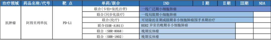 值得注意的是,除了卡瑞利珠单抗,恒瑞在研管线中还有一款PD-L1阿得贝利单抗以及一款PD-L1/TGF-β双抗SHR-1701在开发。其中阿得贝利单抗有6项适应证在研,全部为联合疗法,联合卡铂+依托泊苷用于治疗一线广泛期小细胞肺癌的适应证上市申请已经获受理,联合化疗用于一线局限期小细胞肺癌和可切除的Ⅱ期或Ⅲ期非小细胞肺癌围手术期治疗两个适应证进行到了III期临床。