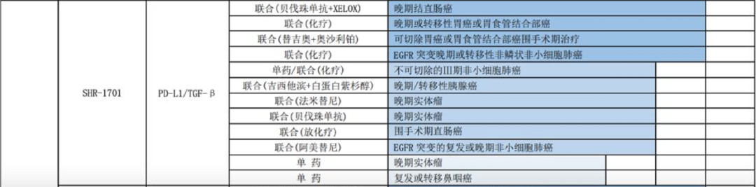 PD-L1/TGF-β双抗SHR-1701有12项适应证在研,其中晚期结直肠癌、晚期或转移性胃癌或胃食管结合部癌、可切除胃癌或胃食管结合部癌围手术期治疗以及EGFR 突变晚期或转移性非鳞状非小细胞肺癌等4项适应证进行到了临床III期。