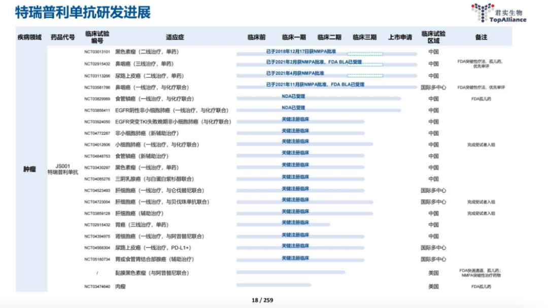 根据君实生物7月7日最新公告,特瑞普利单抗有5项适应证已于中国获批,包括黑色素瘤、鼻咽癌、尿路上皮癌、食管鳞癌、非小细胞肺癌等。特瑞普利单抗已在中国、美国、东南亚和欧洲等地累计开展了覆盖超过15个适应证的30多项临床研究。