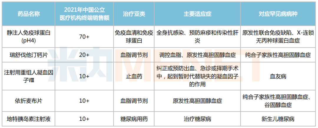米内网数据显示,53个罕见病药中有5个在2021年中国城市公立医院、县级公立医院、城市社区中心以及乡镇卫生院(简称中国公立医疗机构)终端销售额超过10亿元,包括静注人免疫球蛋白(pH4)、瑞舒伐他汀钙片、注射用重组人凝血因子Ⅷ、依折麦布片及地特胰岛素注射液。